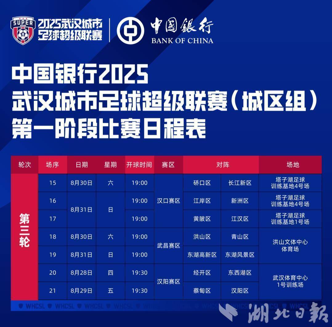 湖北日报讯(记者汪洋)笔据最新公布的汉超(城区组)第一阶段赛程,本周将进行第三轮共7场比赛,具体为: