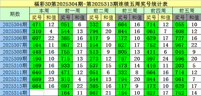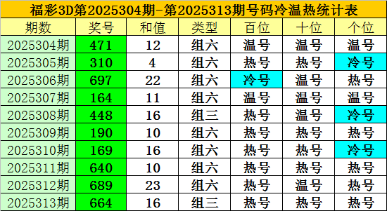 上期归来:福彩3D第2025313期开奖奖号为:664,奖号类型为:组三,奖号冷温热态为:热号+热号+热号。