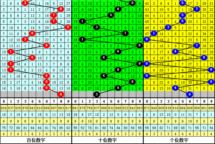 百位上期出现:热号6,该位结合十期以热号出现较多,以冷号出现较少,本期该位温号有5个:3、5、7、8、9,看好温号转热,矜恤号码8。